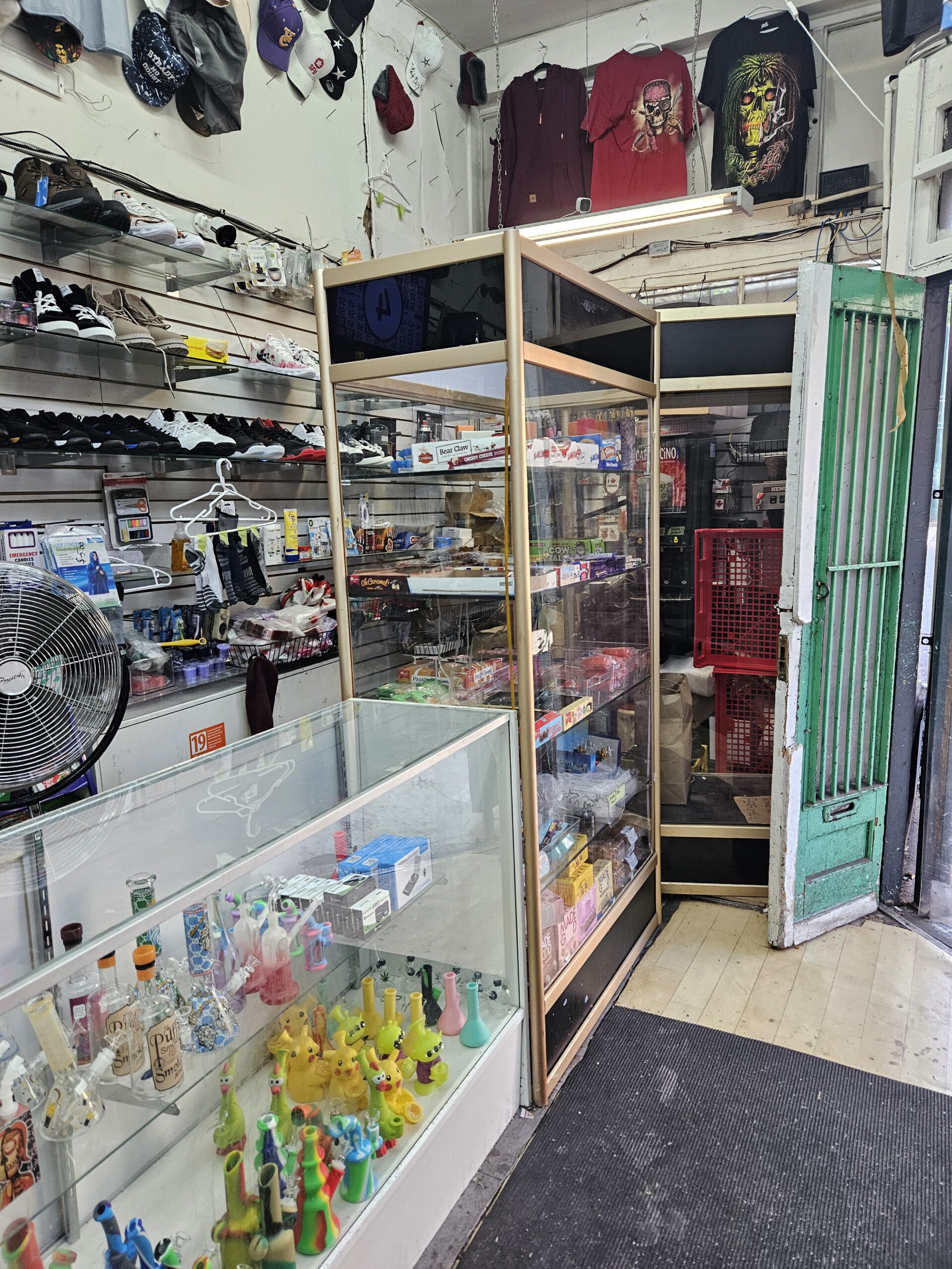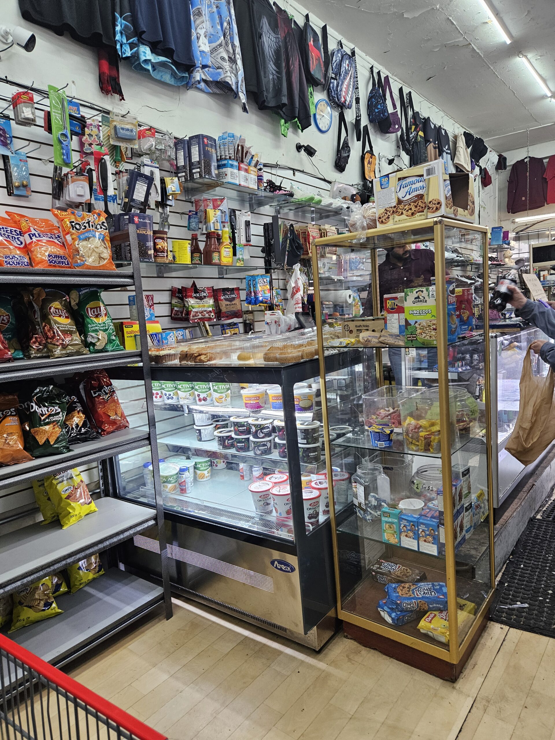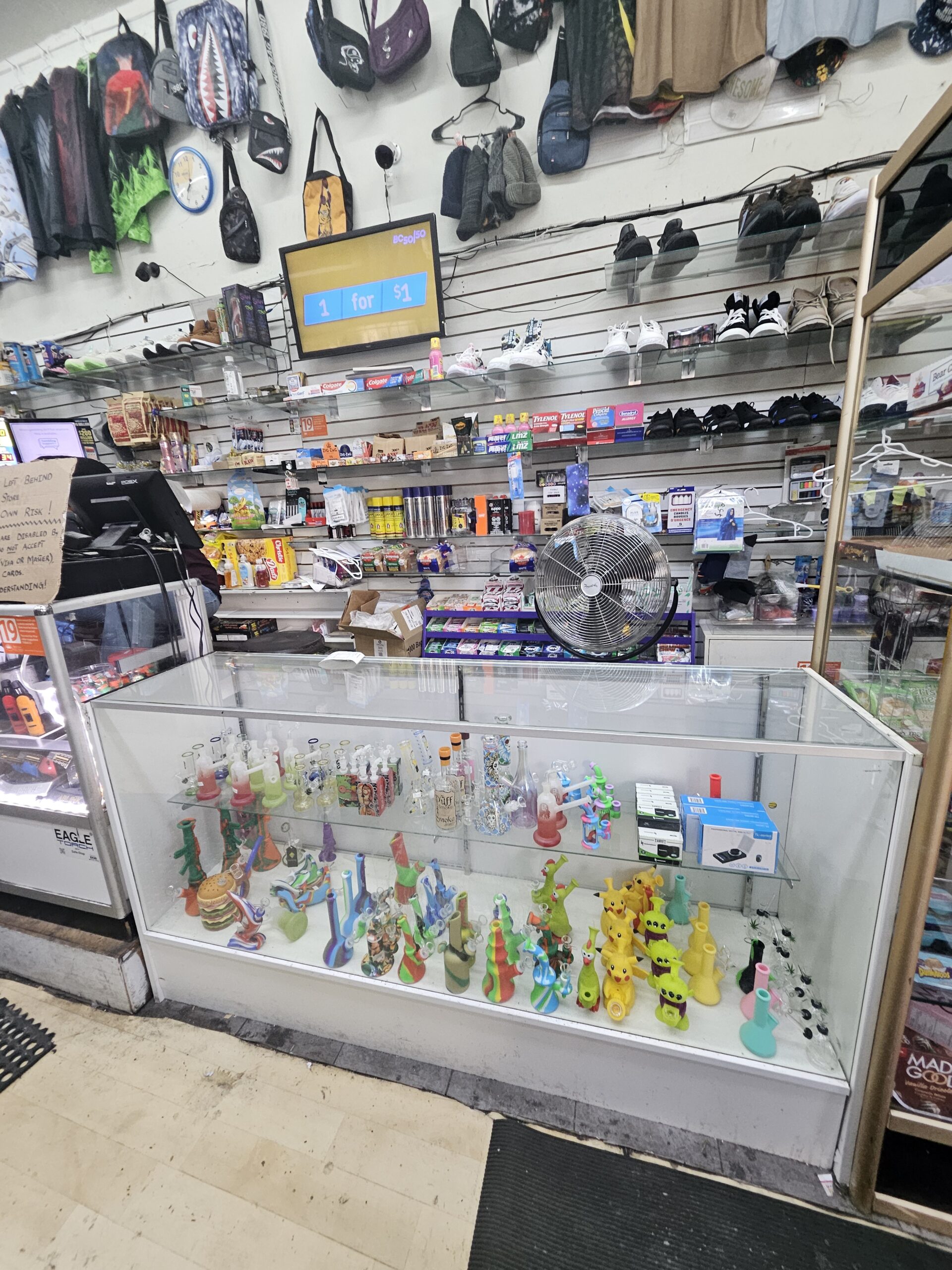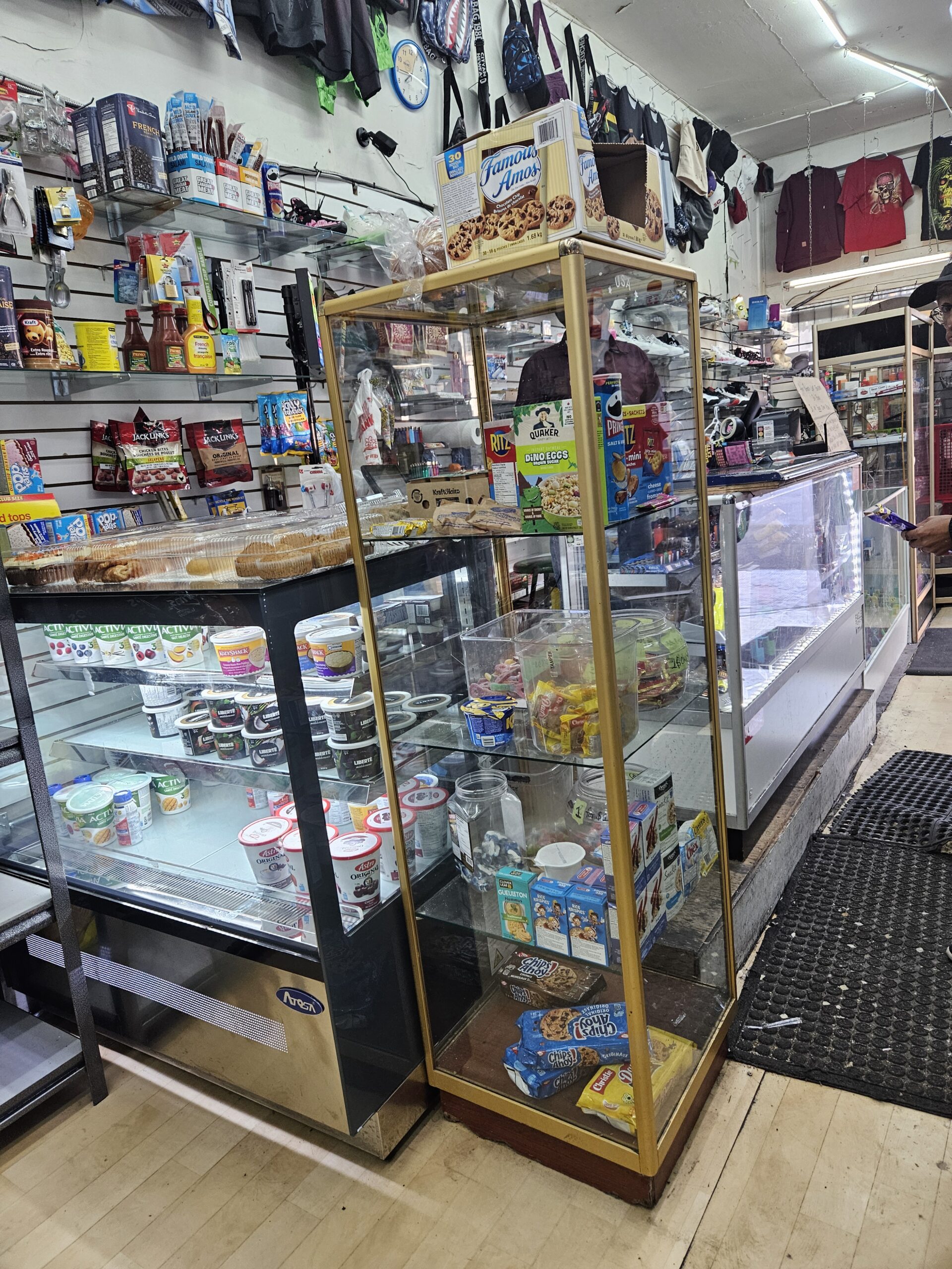 Milk, Pop, Ice Cream, Candy, Small Groceries, Smokes, Sandwiches, Pastries, Chips and other comfort/snack foods. Bread, Milk, Dairy – Yogart, cheese. Bongs and other supplies, tobacco and accessories, canned goods, a large assortment of shoes, backpacks, handbags, and shirts, and more.