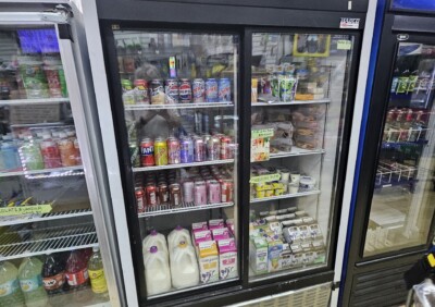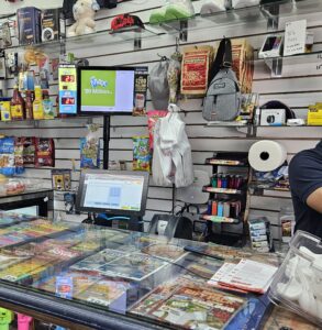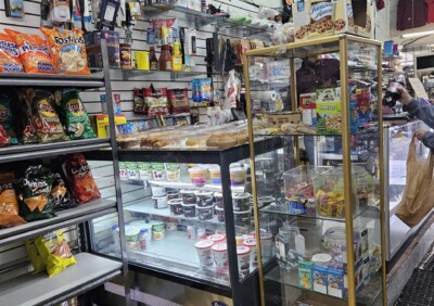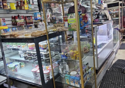 Milk, Pop, Ice Cream, Candy, Small Groceries, Smokes, Sandwiches, Pastries, Chips and other comfort/snack foods. Bread, Milk, Dairy – Yogart, cheese. Bongs and other supplies, tobacco and accessories, canned goods, a large assortment of shoes, backpacks, handbags, and shirts, and more.